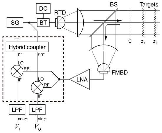 Figure 1 shows a schematic of the measurement system used in this study. The signal generator modulates the oscillation amplitude of the RTD source, from where the output terahertz wave is collimated and sent towards the targets. The reflected beam is extracted by a beamsplitter and sent to the detector, which demodulates the signal (removes the terahertz frequency carrier). An IQ mixer, containing a 90° phase shifter and two mixers, is fed with an LO signal from the same signal generator and with an RF signal from the detector. Since both LO and RF signals have the same frequency, the homodyne mixing produces DC signals at the two IF outputs; these are filtered, digitized, and processed.