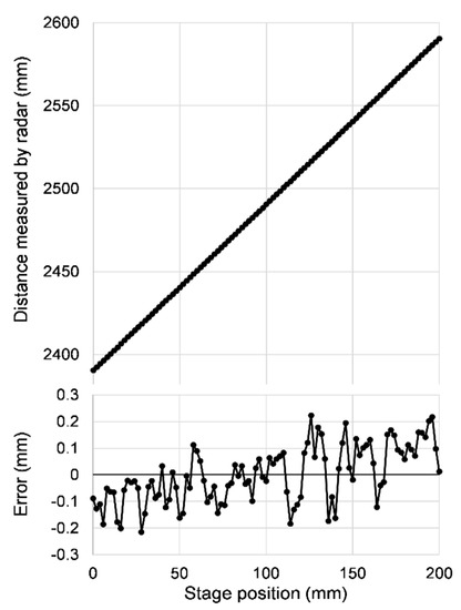 Figure 4 shows the result of such an experiment, in which a flat gold-coated glass mirror was used as target, placed on the motor stage. The upper plot shows how the distance measured by the radar depends linearly on the relative position of the motor stage carrying the target. No departure from linearity can be seen at this scale. We fit the measured data to a linear function of slope fixed to 1 and calculated the measurement error of each point as the difference between the measured distance and the linear fit. The result is shown in the lower graph.