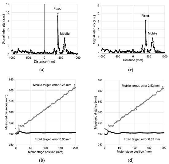 Figure 5b,d, the same linear fitting was used as in the case of a single target, but obviously the slope of the fixed target was set to 0; for the mobile target the slope was set to 1. In addition, the leftmost part of the data was excluded, as the peak detection in that range was unreliable, and only the range from 20 to 200 mm of the horizontal axis was used. With these provisions, the standard deviation for the half mirror is found to be 0.60 mm, whereas for the full mirror it is 2.25 mm. When the fabric is inserted into the beam, both errors increase slightly, to 0.82 and 2.53 mm, respectively, which can be attributed to a degraded signal-to-noise ratio.