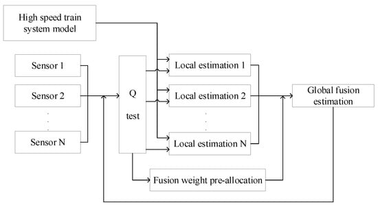 In recent years, with the development of sensors, train monitoring data have become diverse. Therefore, fully mining the value of multi-source data and realizing the fault diagnosis are of great significance based on multi-sensor information fusion [20,21]. In multi-sensor fusion, centralized and distributed fusion methods are mainly used to process the monitoring data. In centralized fusion, all measured data from multiple sensors are stacked into a sensor measurement (with higher dimensions), and the specific fusion rules are not required [22,23]. However, the application of centralized fusion is limited due to some defects of its own. Therefore, various distributed fusion methods have been proposed. In distributed fusion, the state of each sensor is estimated, and then the estimations are sent to the fusion center by certain fusion criteria. For example, based on linear minimum variance, the matrix-weighted multi-sensor optimal information fusion criterion is investigated in [24,25], and distributed fusion estimations are obtained. On this basis, the multi-sensor optimal data fusion based on adaptive fading unscented Kalman filter (UKF) and unscented transform is presented in [26]. During the train operation, the integrated navigation estimation based on the GPS/INS and tachometer is considered in [27,28,29]. According to the above literature, it is not difficult to find that, compared with using only a single source of monitoring data, the fusion estimations based on multi-source data can effectively reduce the influences of various adverse factors on the analysis results.