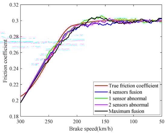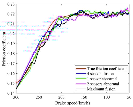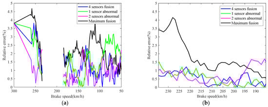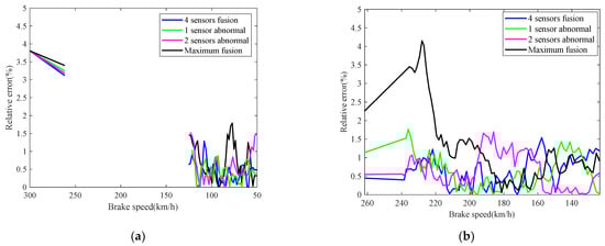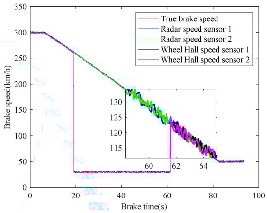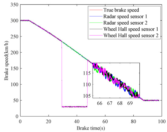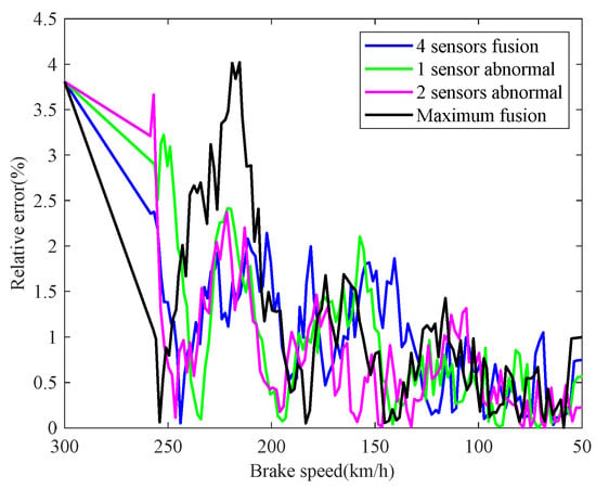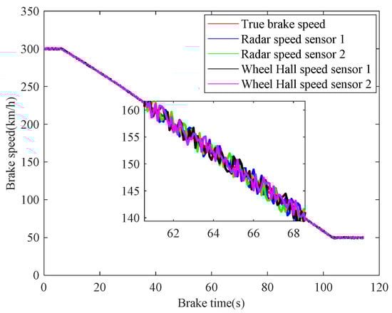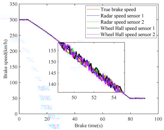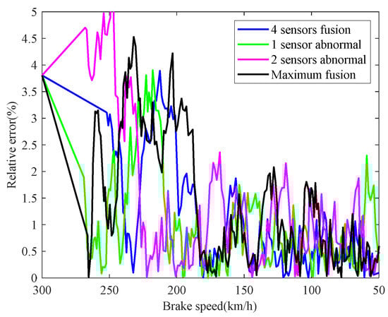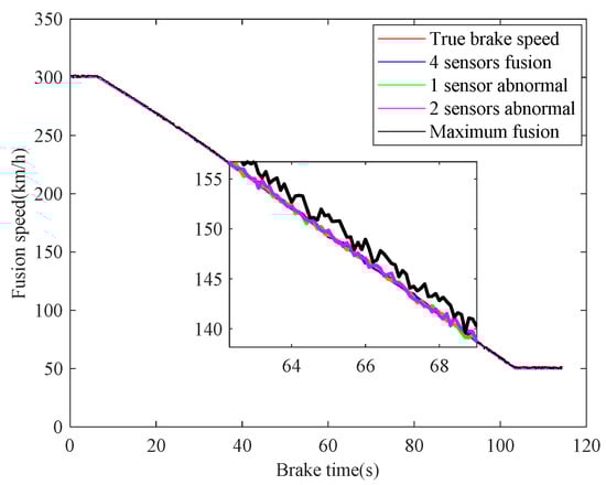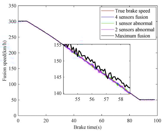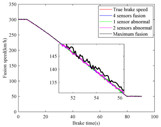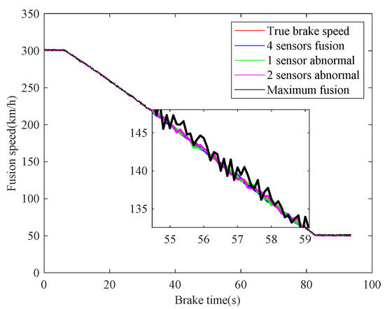 In case 1, the braking characteristics of the train are studied with normal adhesion. The braking speed measurements are shown in Figure 6. The red curve is the true braking speed, and the other four curves represent the four sensors’ speed measurements. As can be seen from the Figure 6, in the emergency braking, the train speed decreases from 300 km/h to 50 km/h, the braking time is 73.3 s, and the average deceleration speed is 0.9474 m/s2. The train speed fusion results are shown in Figure 7. The red curve is the real speed of the train, the blue curve is the fusion result of the four speed sensors, the green curve is the fusion result of the three speed sensors in the case of abnormal or lost data caused by sensor failures or network transmission failures, the magenta curve is similarly the fusion result of the two speed sensors, and the black curve is the maximum speed fusion result equipped in the train’s on-board ATP. It can be seen from the Figure 7 that the multiple speed measurements can be fused effectively by the method proposed in this paper. Affected by the missing or abnormal sensors measurements, in the case of meeting the actual accuracy requirements of the system, the fusion accuracy of four speed sensors is slightly higher than the other two cases. However, when comparing with the maximum fusion strategy equipped in the train’s on-board ATP, the fusion accuracy of the proposed method is obviously higher.