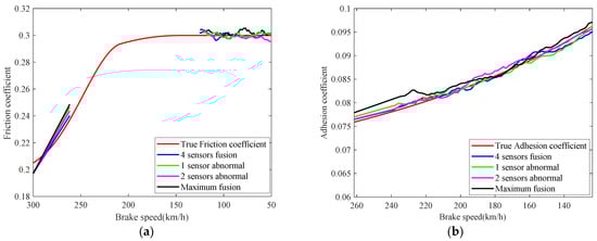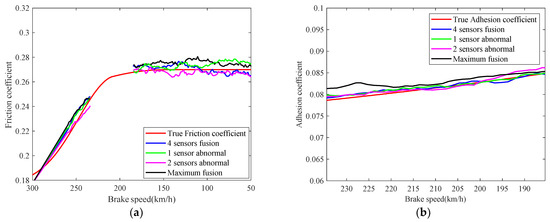 The speed fusion errors and parameter identification errors are shown in Table 6. It can be seen from the table that the speed fusion error, identification errors of the friction coefficient, and the adhesion coefficient of the proposed method are ±1.4364%, ±2.4967%, and ±1.6733%, respectively. The speed fusion error, identification errors of the friction coefficient, and the adhesion coefficient of the maximum fusion are ±2.3751%, ±2.4989%, and ±1.7875%, respectively. Even for the maximum fusion data with large errors, the braking performance of the brake disc and the real-time wheel-rail adhesion state can be more effectively and accurately obtained.