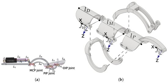 Each finger of the exoskeleton has a single active degree of freedom (DOF) and three mechanical connections (links) corresponding to the three phalanges. The mechanism has an 8-bar with 10 joints overall, confined to the dorsum of the hand in order to minimize sensory feedback interference and low apparent inertia to the intended subjects. Figure 1a shows the exoskeleton design, where each circle in red represents a rotational joint, while the double-ended arrow represents a prismatic joint. The joints named J10, J8, and J5 correspond to the distal interphalangeal (DIP), proximal interphalangeal (PIP), and metacarpophalangeal (MCP) joints of the human finger. As detailed in Figure 1b, five mechanical pieces compose the finger links, with only three having direct contact with the human phalanges (, , ), while the other two are in charge of synchronizing the movement of all the pieces according to the external force received by the linear actuator displayed in Figure 1a.