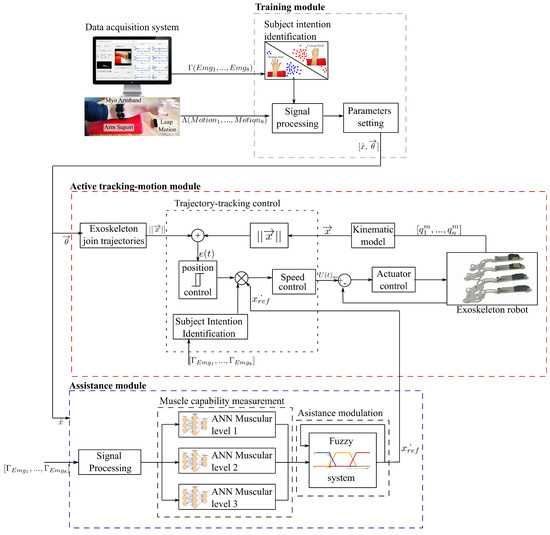 Proposed assistance control architecture based on the “assist-as-needed” paradigm. Three main modules are defined for training, active tracking-motion, and muscle capability measurement.