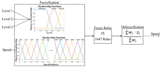The assistance modulation block calculates the velocity reference based on the ANN classifier’s outputs and the previous velocity, as presented in Figure 3. A MISO (multiple-input single-output) fuzzy system with velocity feedback was designed and implemented to calculate the output velocity. A logical system is created to describe and model the system’s required behavior. As the first step, the input ranges are divided to establish the necessary combinations. Then, the action rules are designed to train the fuzzy system.