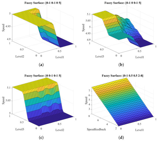 Fuzzy inference model output surface for different input combinations. (a) Inputs for levels 1 and 2. (b) Inputs for levels 1 and 3. (c) Inputs for levels 2 and 3. (d) Inputs for level 1 and velocity feedback. Each plot presents the input values in the following order: , , , and .