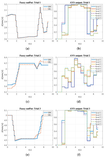 Figure 5 presents the ANN and fuzzy results for one subject. The error between simulation and experiments was approximately . This difference is mainly due to the change in the membership degree provided by the ANN classifiers and the on-off control, since the fuzzy system does not update the speed value when the hand movement is not enabled.