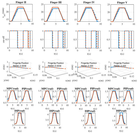 Low-level on-off position controller to drive the linear actuators of the exoskeleton for simulation (red lines) and experiments (blue lines). The first row corresponds to the actuator displacement , the second row to the on-off control output, the third row to the Cartesian position of the fingertip, and the last two rows to the joint positions (MPC, PIP, and DIP).