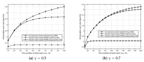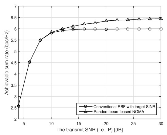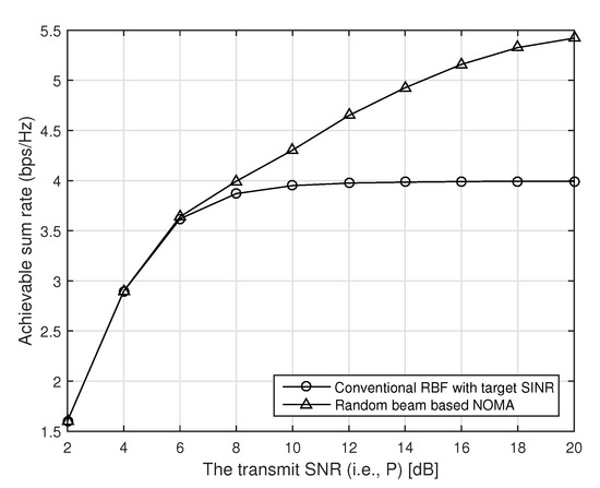 In Figure 3, we compare the achievable sum rate of the conventional random beamforming and our proposed random beam-based NOMA with respect to the transmit SNR when there are total fifty users (i.e., ), and the target SINR is fixed to one, i.e., . As we can see in Figure 3, the performance of the conventional random beamforming is saturated as target SINR is achieved as the transmit SNR increases. In our proposed random beam-based NOMA, however, the achievable rate increases as the transmit power increases because each beam can support more users with more transmit power.