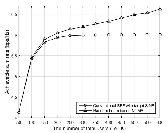 In Figure 4, we compare the achievable sum rate of the conventional random beamforming and our proposed random beam-based NOMA with respect to the number of users when the number of transmit antennas is six, and the transmit SNR is 10 dB (i.e., ). The target SINR is fixed to one, i.e., . As we can see in Figure 4, the performance of the conventional random beamforming is saturated as the number of users increases because the target SINR is achieved for all beams. In this case, the transmitter can support at most six users, so the maximum achievable rate with the conventional random beamforming becomes . In our proposed random beam-based NOMA, however, the achievable rate increases as the number of users increases because our proposed scheme can support more users at each beam with NOMA.