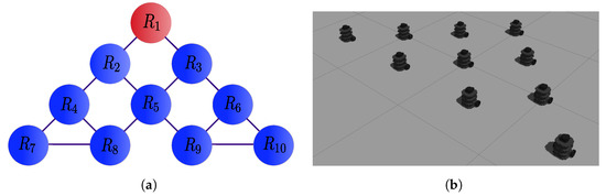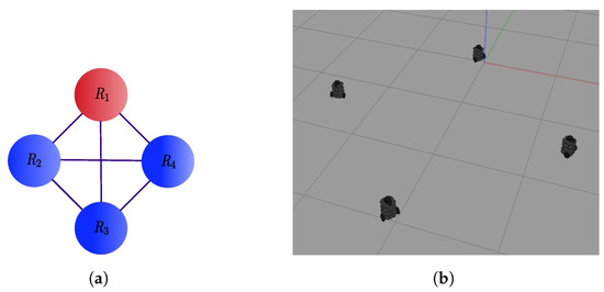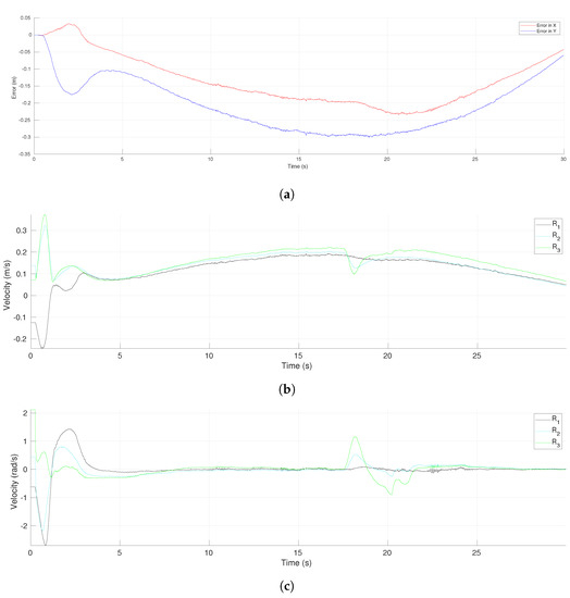 Figure 18b,c show the profiles of the computed robot velocities (linear and angular, respectively) for each agent. An initial transient was appreciated during the first 5 s and after that, the velocities evolved very close each other until the robot