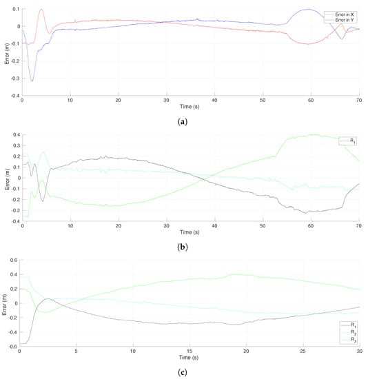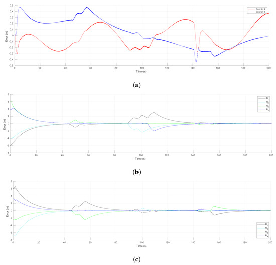 Figure 18a. One can observe an initial transient and a maximum error slightly after the middle of the time, which was expected given the form of the reference trajectory with maximum velocity in the middle of the trajectory. After that middle point, the errors in both coordinates were reduced to reach low final values. The effect of the obstacle avoidance performed by