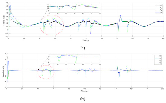 Figure 7a,b, for the linear and angular velocities, respectively. During the first seconds, some important changes were appreciated in the angular velocities due to the DDRs having to align their orientation to the one imposed by the reference trajectory of the leader. It can be seen that all the velocities were the same when the virtual agents are in consensus (the robots move in formation), for instance around 40 s and 85 s. As expected, the evasion actions yielded changes on the velocities evolution, mainly among the follower agents, for instance, the robot