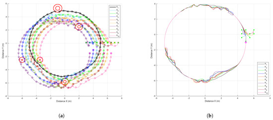 Figure 10b. It can be seen that the circular trajectory imposed by the leader was well tracked by the 10 agents except when evasion actions were performed, however, after a transient the group of robots returned to consensus. The final consensus value reached when the leader trajectory ended in 180 s was the point
