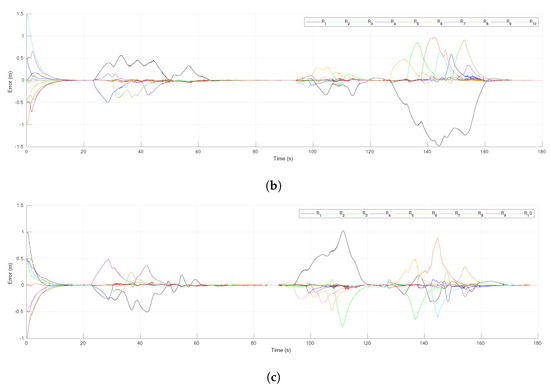 Figure 12b,c, respectively. Nevertheless, the consensus errors converged asymptotically to zero after the transients due to evasions and they were null at the final position where the leader stopped at time 180 s.