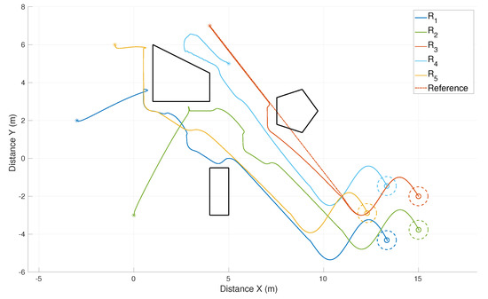 Figure 10a, where one can observe several evasion actions of different agents to avoid collisions with the fixed obstacles and between robots. The trajectories of the virtual agents (variables