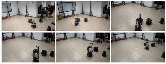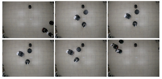 Figure 16 shows some snapshots of the video with the initial configuration at the top left and the final formation at the bottom right. Some intermediate positions are presented where one of the DDRs was avoiding the obstacle and also caused the others to move. This was clear in the trajectories of the robots as given by the motion capture system that can be observed in