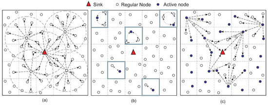REBORN example: (a) the sink node starts a controlled flooding to send its position information to the network; (b) the nodes in each cell, which are in the discovery state, elect the node that will remain active; (c) an active node sends its data by broadcast, and active nodes in adjacent cells opportunistically forward the data toward the sink node using a greedy forwarding scheme.