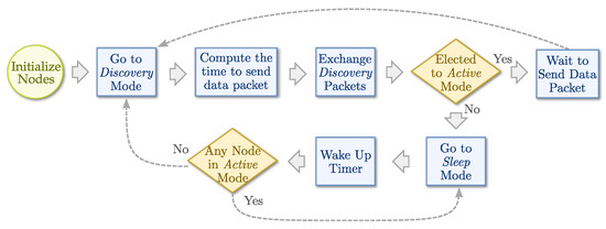 When a node enters the save state, all timers already configured are deactivated. However, it is possible for the node to switch to a more battery-saving mode. In these cases, the timer configured upon receipt of a discovery message will be activated (line 50). Finally, when this timer expires, the node returns to discovery mode (line 52) and the election process is restarted. To better visualize all of these steps and state changes, Figure 2 shows a flowchart of states and decisions for the nodes.