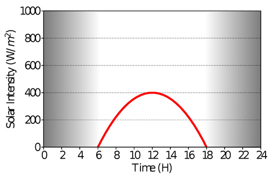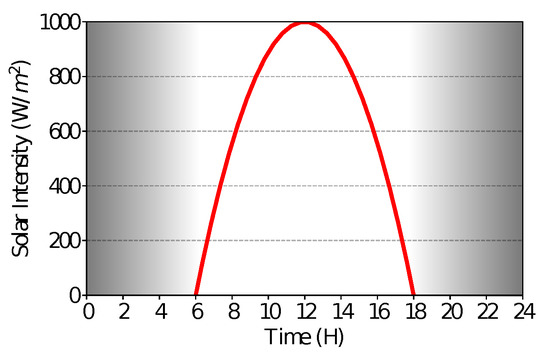 The first step is to understand the behavior of the solar intensity. As shown in [37], the light intensity begins approximately at 06:00, grows up to noon, and decreases until 18:00. To model this behavior, we used a quadratic function fit with three hour/solar-intensity points: (6, 0), (12, 1000), and (18, 0). These points were used to find the coefficients of the function, shown in Equation (1). The value 1000 at noon was used because of the Watt-pico (Wp), a common measure used in solar panels, to represent the maximum solar intensity input.