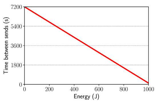 To control how both the charge level of the battery and the solar intensity are perceived during the harvesting process, a parameter K was adopted to give more freedom to the algorithm and manage the packets sent with the priority of choice between the solar intensity and battery energy. This parameter is a configuration value that can be set during the network initialization or changed during operation. All nodes have the same K value that can vary from 0 to 1 and is associated with battery usage. For instance, a value of assumes that the node will wait a while before sending its information, which corresponds to 60% of the remaining time of the battery charge, added to 40% of the time of the solar intensity perceived. Finally, the final version of our model is shown in Equation (7).