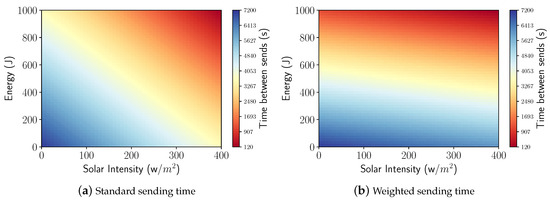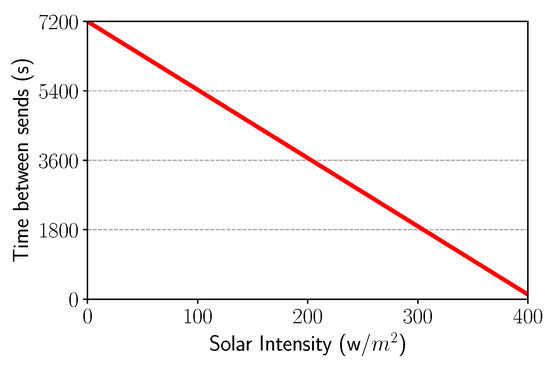 By using a value of and the values adopted in our simulations, the corresponding time intervals are depicted in Figure 7b, implying that the battery remaining has more importance than solar intensity.