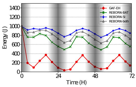 Figure 8 shows the average energy consumption during the 3 days of simulation. As can be seen, the GAF-EH received the lowest score among all, since there is no type of management in sending packets with regard to energy expended. The results also show that the REBORN-BAT algorithm, which has the control based on the battery level, the energy saving is expressive in relation to the algorithm that does not have any control. On the other hand, the energy consumption observed in the execution of the REBORN-SI algorithm is lower than that observed in all others. This is due to the fact that the amount of packets sent during the night is the minimum possible due to the energy management controls. Furthermore, REBORN-SI is able to modify the intervals for sending packets according to the solar intensity, that is, the packets will be sent regularly only during the period of energy harvest. Finally, these results show that our REBORN-both algorithm was able to get the best of both cases, i.e., to send more data when energy is abundant and save energy in other cases.