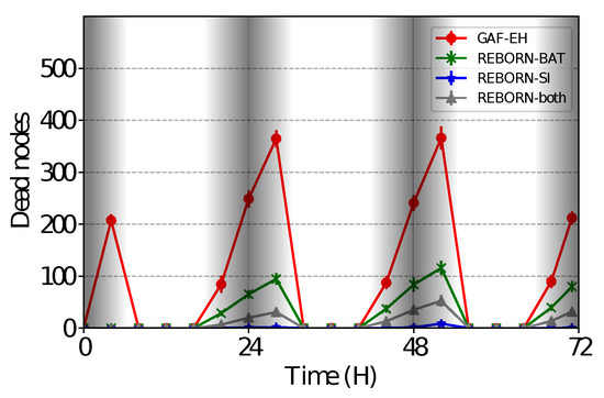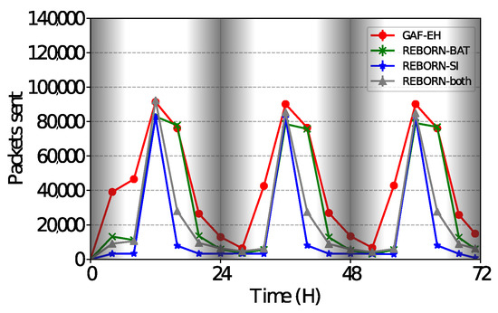 As shown in Figure 10, it is possible to observe that in the REBORN-SI algorithm, there are periods of inactivity perceived during the first two nights of simulation. This is due to the increase in the time interval between shipments, which in this sense occurs every 2 h, making it impossible to deliver packets to the sink during these periods of inactivity. Although REBORN-both has a greater number of dead nodes than REBORN-SI, we can see that the delivery rate has not been affected. In this sense, we observed the effectiveness of the controls implemented in our proposed algorithm. Finally, it is possible to observe that a relevant amount of packets to be forwarded by the GAF-EH algorithm do not reach the sink. This behavior was already expected, since the algorithm does not have energy economy controls.
