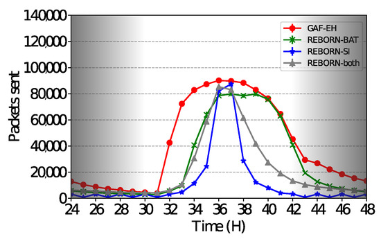 Regarding REBORN-SI, REBORN-both sends a larger number of packets although both have similar delivery rates. Based on these evaluations, it is possible to state that REBORN-both can send larger quantities of packets to the sink and still maintain high rates of delivery. The relation between cost and benefit of using the REBORN-both algorithm can be adjusted through the parameter K, as observed in Equation (7). Figure 12 shows details of the simulation performed between 24 and 48 h.