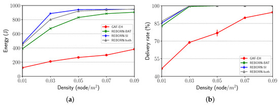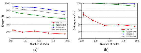 Finally, the scalability was evaluated by increasing the network size from 225 to 961 nodes with a constant density of 0.03 nodes/m. The grid in which the sensors were implanted was resized according to the number of sensor nodes. As can be seen from Figure 14a, energy consumption tends to increase as the number of nodes in the grid increases. In this sense, as the density value holds the same, more cells are generated in the grid. Because of the increase in the number of cells in the grid, the number of packets to be forwarded also increases, according to the position of the nodes in relation to the sink, that is, the closer the node is to the sink, the more packets it will go forward. In this way, a greater amount of energy will be spent in the referral process. Finally, despite the observed energy cost, REBORN-both shows scalable because it presents a satisfactory delivery rate even when the number of cells in the grid increases.