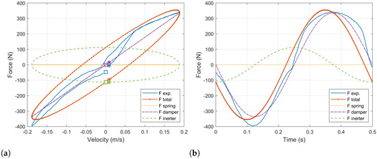 It has to be noted that the equivalent spring force in the force–velocity diagram is also an ellipse whose principal axis corresponds to the x axis. Nevertheless, it is seen as a straight line because the equivalent spring forces is small compared to the other components and, thus, its secondary axis is much smaller than the principal one. As it can be appreciated, for the ball-screw damper, the equivalent inertia force component predominates at low velocity. This fact will be determinant when one tries to reproduce the response of the physical damper.