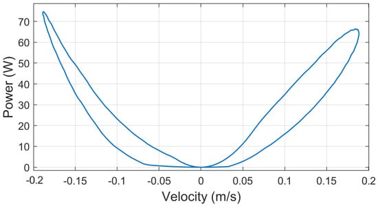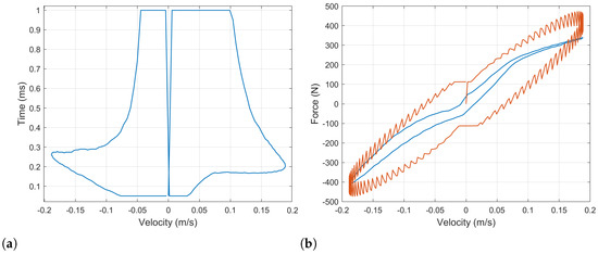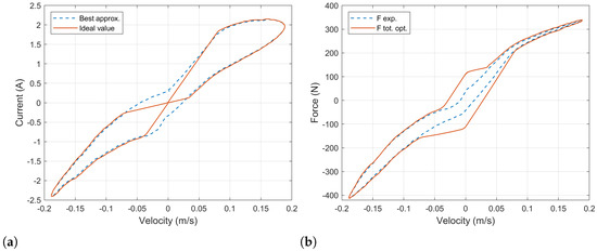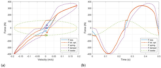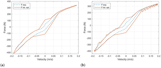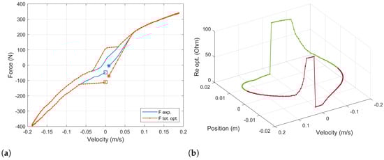 Figure 6a shows the force–velocity diagram comparing the experimental data of the baseline damper with the computed force of the ball-screw-damper’s equations. These values were obtained with the optimal values of the load resistor, which are represented in