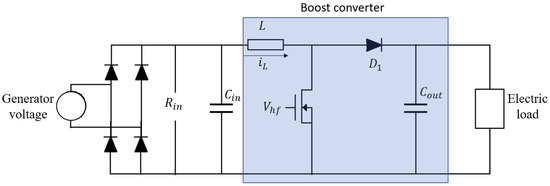 34]. In order to evaluate the behavior of the BS-EHSA system using this kind of load, a DC–DC boost circuit has been selected considering the low output voltage at the generator’s terminal for low velocities, and such a circuit is depicted in