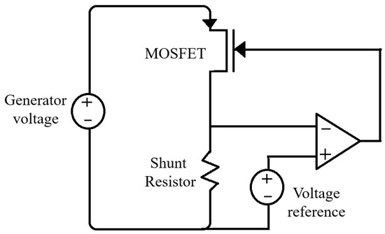 Figure 14. The circuit uses a MOSFET to control the current taken from the voltage source. The shunt-resistor is used to measure the current that is compared with the a reference in the operational amplifier.