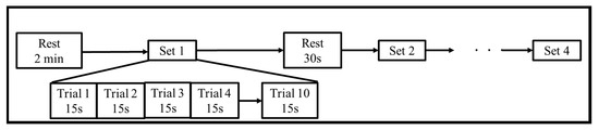 We used four different motor tasks. RM is a task in which a participant moves his or her dominant hand in real-hand grasping movement. Inten is a kind of isometric contraction that involves the static contraction of a muscle without any visible movement in the angle of the joint. MI is a task in which participants carried out a mental process by rehearsing or simulating a given motor action. OL is a task in which participants just looked at virtual hand’s movement without any brain imaging. To ensure the absence of bias, we designed the motor task with four patterns: Inten→OL→RM→MI, OL→RM→MI→Inten, RM→MI→Inten→OL, and MI→Inten→OL→RM. The participants performed one pattern randomly selected from these four patterns. Figure 2 shows the task flow of the experiment. There was a 2 min rest period as a baseline. Then, there were 8 s of rest, 2 s of being ready and 5 s of the task in 1 trial. We designed a total of 40 trials with 4 sets in each motor task. A fixation cross was shown on the virtual palm during rest, which disappeared during the 2 s ready stage. The virtual hand grasping appeared on the monitor in HMD during 5 s task. The time to break between each motor task was 5 min, then RM, Inten, MI and OL tasks were performed, respectively. Figure 3 shows the first ten trials data of one subject in each task for both EEG and EMG data.