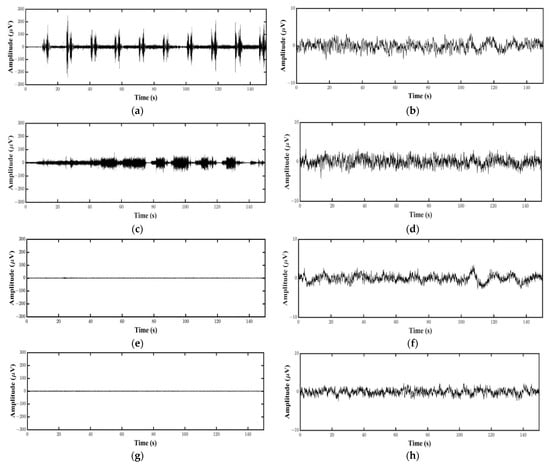Ten trials of one subject’s EEG and EMG data: (a) EMG data in RM task; (b) EEG data in RM task; (c) EMG data in Inten task; (d) EEG data in Inten task; (e) EMG data in MI task; (f) EEG data in MI task; (g) EMG data in OL task; (h) EEG data in OL task.
