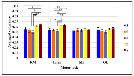 Comparison of the averaged coherence based on frequency band in four motor tasks. Error bars show the standard error of the mean. * p < 0.05 ** p < 0.01.