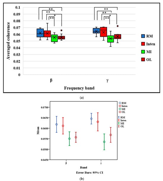 Comparison of the averaged coherence in beta band and gamma band based on motor tasks: (a) The top and bottom of each box represent the 25th and 75th percentiles, respectively. Cross sign inside each box represents the mean value. The horizontal black line represents the median. The whiskers are drawn from the ends of the interquartile ranges to the minimum and maximum values. * p < 0.05 ** p < 0.01. (b) Circle marked points represent the means and bars of these points represent the 95% CI of the within-subject standard error.