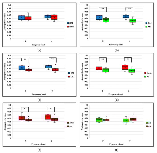 EEG-EMG coherence comparison across all subjects in beta band and gamma band: (a) RM task versus Inten task; (b) RM task versus MI task; (c) RM task versus OL task; (d) Inten task versus MI task; (e) Inten task versus OL task; (f) MI task versus OL task. * p < 0.05 ** p < 0.01.
