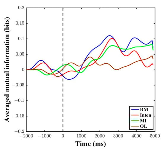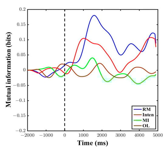 We calculated the averaged mutual information across all subjects. In the results, the RM showed the highest amount of mutual information during the 5 s motor task, then the Inten task followed, with the second highest amount of information between brain and muscle signals. Then, the MI and OL tasks showed a slight increase in mutual information in averaged data, and this might concern the subjects achieving focused attention and sensory motor integration after some period of stimulus, as shown in Figure 9. In addition, there were some fluctuations for movement preparation before the subjects performed the tasks.