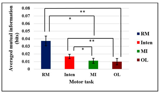 Averaged mutual information comparison across all motor tasks. The asymptotic significance (two-sided tests) is displayed with a standard error bar. The significant differences in each motor task were * p < 0.05 ** p < 0.01.