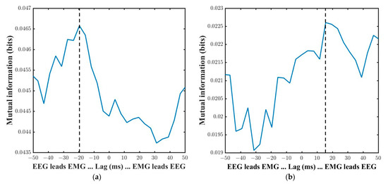 We computed mutual information repeatedly for the multiple time lags by taking the shifting one signal with respect to another by using Equation (7). Then, it was graphed by calculating mutual information between two signals by fixing EEG signals and measuring the information according to the delay time in EMG signals [36] (p. 404). If the information present at the location EEG is transmitted to location EMG, there will be a peak in the curve with TDMI(X(t), Y(t + τ)) at τ > 0. If the information present at the location EMG is transmitted to location EEG with delay time TDMI(X(t), Y(t + τ)) at τ < 0. A peak that occurs for τ = 0 implies that a zero delay for the EMG and EEG may be due to the nullification of two strong counteracting forces driven from EEG to EMG and opposing drive from EMG to EEG [37].