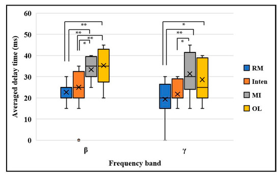 Based on the nerve fibers’ conduction velocity of 50–65 m/s in the arms and the distance between the scalp and the hand of approximately 1.2 m, most delay times are in the range from 18–24 ms [54]. We chose the beta (13–30 Hz) and gamma (31–50 Hz) ranges since there has been a lack of delay time analysis based on these bands. Our results indicate that the averaged delay time values were within the range of 15–25 ms for RM and Inten tasks. These ranges were consistent with physiological facts, as we discussed above [4,54]. Moreover, there was a longer delay time in the no movement task condition of the MI and OL tasks. These results showed that the time will take longer or higher for the transmission of signals from one point to another if there is no high coupling or greater mutual information. The gamma band delay time averaged values showed a smaller amount of delay time than the beta band delay time averaged values.