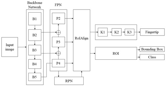 The proposed fingertip detection method adopts a two-stage methodology as the reasons mentioned above. Figure 2 shows the adopted deep learning structure, which is divided into four parts, including the backbone network, the FPN (Feature Pyramid Network) [18], the RPN (Region Proposal Network) [19], and the three-layer CNN branch network to detect the fingertip.