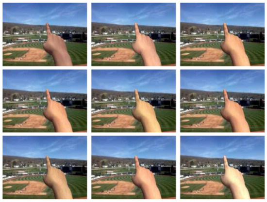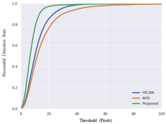 In order to compare the proposed scheme with existing methods, we used the same test dataset as in [14,15], which is known as the EgoFinger dataset, containing 12,974 images. Average Pixel Error () was used as the evaluation metric, which indicates the pixel distance between the detected location and ground truth. Table 2 shows that the proposed scheme has a much smaller , demonstrating that it can accurately pinpoint the fingertip. Figure 13 shows the successful detection rates with different threshold values. A successful detection means that the distance between the detected fingertip from the ground-truth location is smaller than the threshold measured in pixels. In the proposed scheme, the threshold can be set smaller than 20 pixels and the successful detection rate can be higher than .