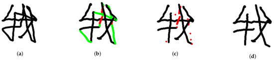 Steps involved in removing redundant connections from Chinese characters: (a) all trajectories appear in a single curve or stroke; (b) all redundant connections are found (the green segments represent the connections from the bottom right to the top left, while the red segments represent the connections from the bottom left to the top right with a steep slope); (c) all of the green segments are removed; and (d) the final results after the red segments are removed.