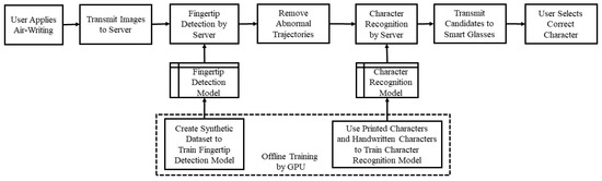 After the fingertip can be traced successfully, air-writing for smart glasses can be implemented. Building a neural network for fingertip detection directly on smart glasses is currently not feasible due to hardware constraints. There are thus two options. One option is to detect the fingertip in a smart phone that is connected wirelessly to the smart glasses. The other option is to send the captured scenes to the a backend server for the fingertip detection. We adopted the latter option because the former may still raise concerns about the power consumption of the smart phone. To reduce the computational burden of smart glasses, each frame is streamed using Motion JPEG. Our server platform is equipped with a single GTX 1080 Ti GPU (manufactured by NVIDIA Corp., Santa Clara, CA, USA). The frame is sent to the server by the smart glasses via wireless networks for subsequent detection and recognition. After the frame is acquired by the server, the model will locate the fingertip in real time and store the current coordinate of fingertips into an array. When the model does not detect a fingertip in a few frames, the process of storing the coordinates is halted. If the user finished writing and would like to see the results, what he or she needs to do is to move the fingertip away from the camera. The points on the writing trajectories are represented by the stored coordinates, and the character can be formed by connecting these points.