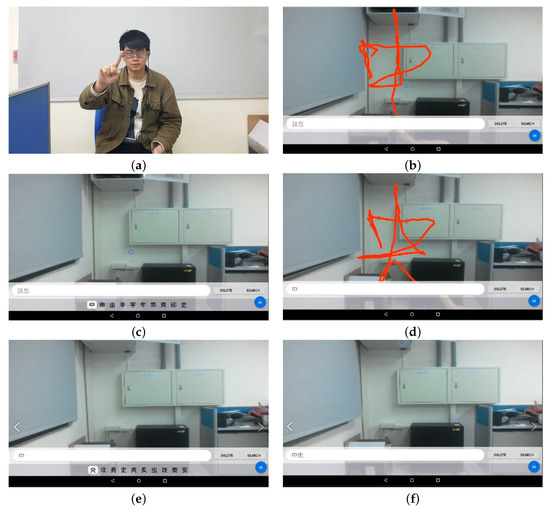 Figure 15 shows the progress of fingertip tracking to form the writing trajectories of a character. The proposed air-writing scheme stores the fingertip coordinates and then connects the points to form the fingertip trajectories. Since the detection of fingertips is fast, the writing trajectories are smooth enough to form a recognizable character. Figure 16 further shows the operations of air-writing for smart glasses in a step-by-step manner. A user in Figure 16a wears smart glasses and writes characters (the word “Central” composed of two Chinese characters is used as an example) in the air as the input. Figure 16b shows the writing trajectories of the first character. It should be noted that the red trajectories are just superimposed in the figure for better illustration. The user does not see these red trajectories as they do not help the writing process. Figure 16c shows that the smart glasses display the first ten candidates, which are determined by the remote server, at the bottom of the screen for the user to select the correct one. After extensive tests, the first candidate is usually the one that the user writes. If not, the user may click the button to move the cursor to select other characters. The selected character is added to the input text field in Figure 16d. The user goes on to write the second character, and again the candidates are listed in Figure 16e. The word “Central” is then displayed in the text field, as shown in Figure 16f.