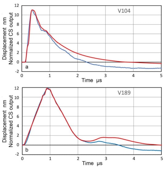 Matching waveforms of LI-based displacement (blue curve) and normalized CS output (red curve). (a) V104 transducer. (b) V189 transducer. Short pulse excitation was used.