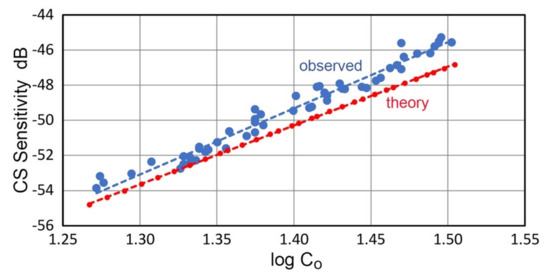 The calculated and observed displacement sensitivity (Scs) values are plotted against the logarithm of Co values (in pF) in Figure 3. The average observed sensitivity of the CS-16 sensor was Scs = −49.5 ± 2.4 dB in reference to 0 dB at 1 V/nm (for the sample size of 55). The average sensitivity of CS-30 sensor was −65.7 dB since a larger air gap (36~48 µm) was needed due to its larger ground contact area. Observed Scs values of CS-16 increased with Co and varied as: